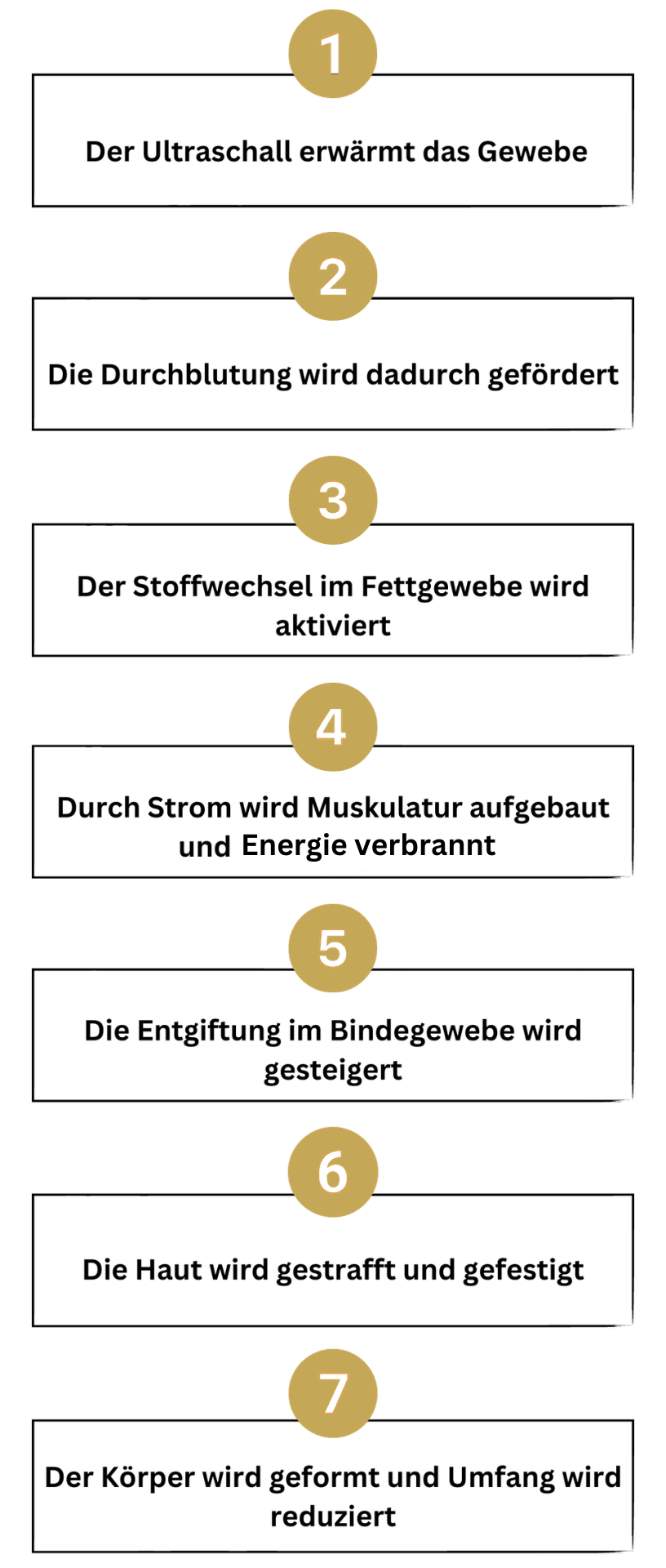 Unser Erfolgs-Konzept basiert auf dem Einsatz von Ultraschall, EMS & Tiefenwärme und führt dich in 4 Schritten zu deinem Traumkörper: